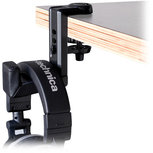 The AT-HPH300 Headphone Hanger from Audio-Technica is a convenient tool for safely storing your headphones in areas where space is limited. The hanger features an adjustable clamp that mounts securely to a shelf, desk, or other surface up to 1.4" thick. The hanger rotates 360°, allowing you to store headphones unobtrusively under the desk or shelf, or have out and ready to quickly grab when needed. Thanks to the hanger’s soft leatherette pad, the headphones are protected from getting scratched or damaged.