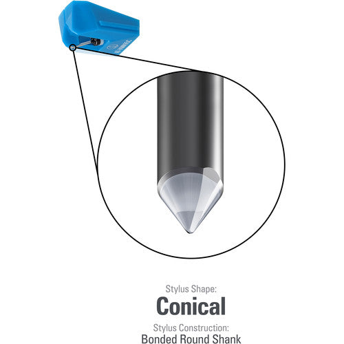 The Audio-Technica AT-VMN95C is a 0.6 mil conical replacement stylus for the AT-VM95C dual moving magnet cartridge. The bonded round shank features an aluminum pipe cantilever. The conical stylus has a spherical tip, which normally touches the center of the record groove walls. This design is well suited for older players with higher tonearm tracking forces.