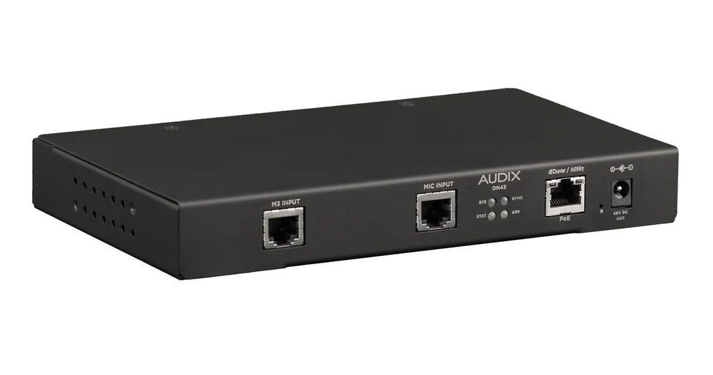 The DN4 Dante AES67 Integrated Microphone System Interface from Audix is the heart of a microphone system that offers audio performance through Ethernet networks. It can be used to provide microphone functions including on-off contact closure and LED status indicators for meeting rooms, convention centers, educational facilities, and houses of worship through a single Cat 5 - Cat 7 cable with RJ45 connections.