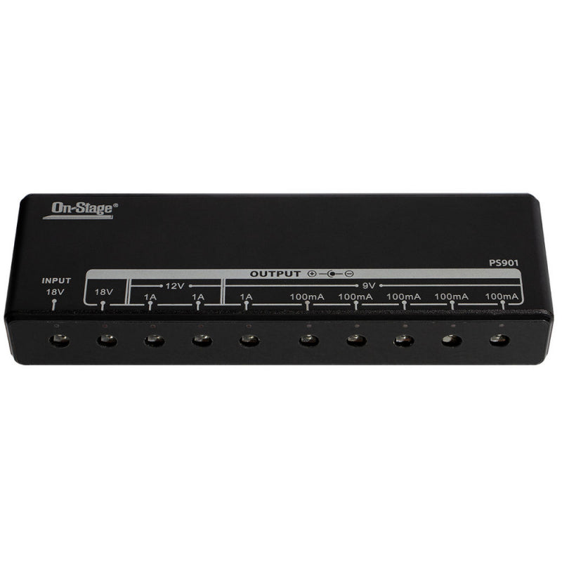 Power an entire pedalboard from a single source with our PS901 Pedalboard Power Bank. Featuring a variety of power output voltages, this unit powers nine effect pedals simultaneously. Or, when using the included daisy chain, it powers 13 pedals at once-no need for individual adapters. Connector cables and converter plugs are included for compatibility with a wide range of effect pedals. For peace of mind, built-in surge protection defends pedals against power-spike damage. The heavy-duty metal enclosure safeguards the internal components to ensure reliable operation.