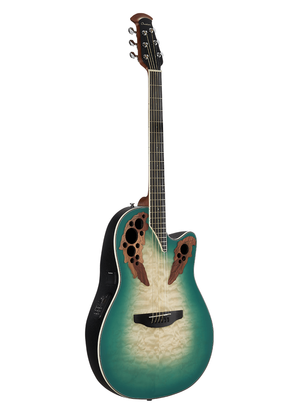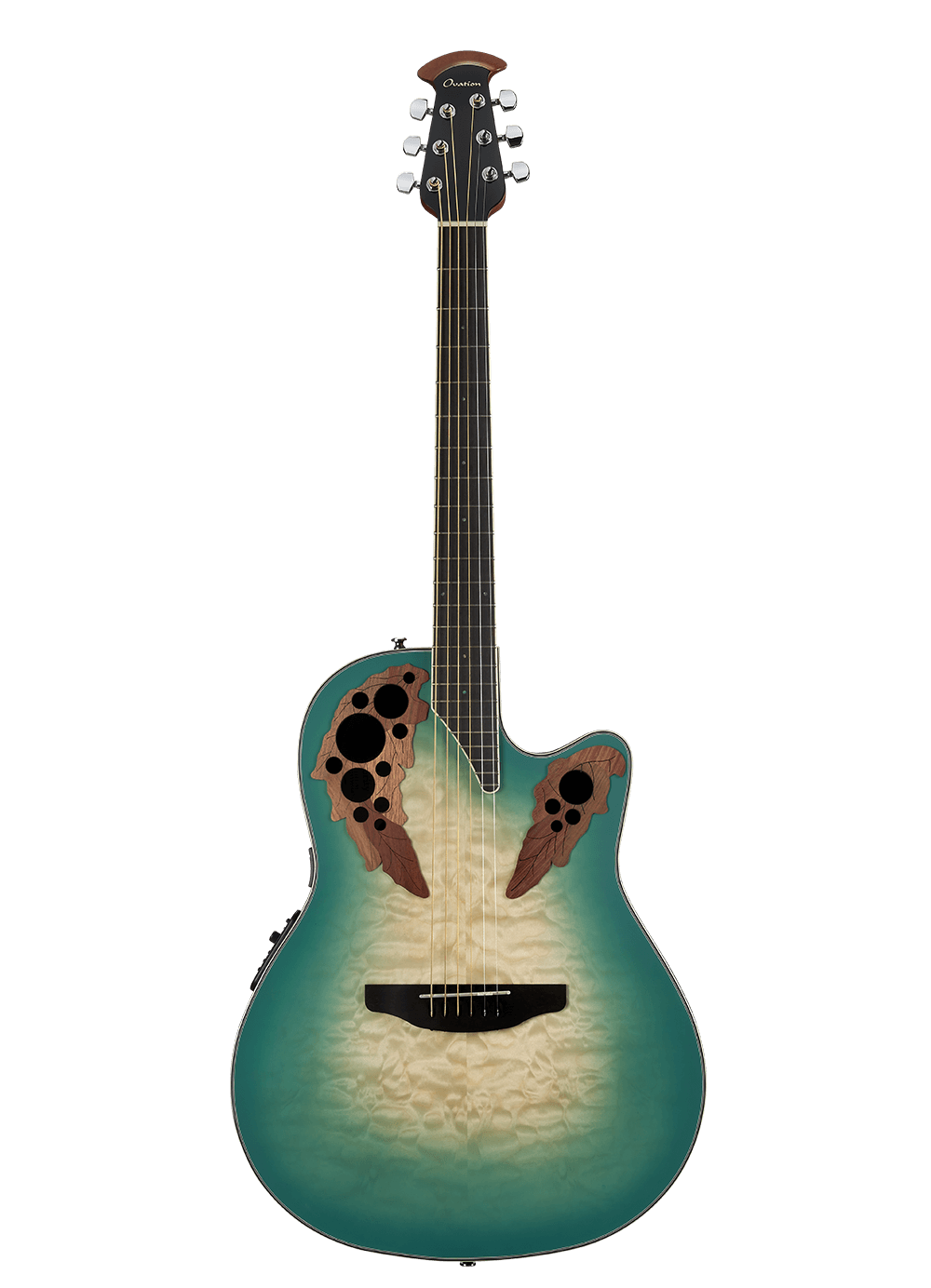 Ovation CE44X-9B Celebrity Elite Exotic® - Mid Depth Lyrachord Body Acoustic-Electric Guitar - Mint Green/Natural Burst On Exotic Quilted Maple