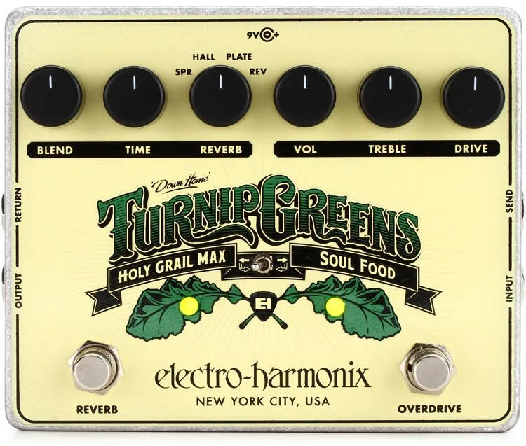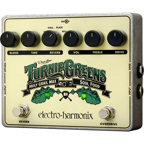 Le Pédale multi-effets Turnip Greens de Électro-Harmonix combine l'overdrive Soul Food et la réverbération Holy Grail Max. Le Soul Food offre des sons transparents commençant par un boost clair et progressant vers un overdrive intense. Il peut ajouter du punch à votre son, poussant un ampli en saturation ou devant d'autres pédales dirt, les conduisant dans de nouveaux mondes de distorsion. Le Holy Grail Max propose quatre réverbérations : Spring, Hall, Plate et Reverse. Une commande analogique Wet/Dry produit une courbe de volume constante lorsque le bouton Blend passe de complètement sec à complètement humide, tout en conservant également le signal sec analogique via la pédale.