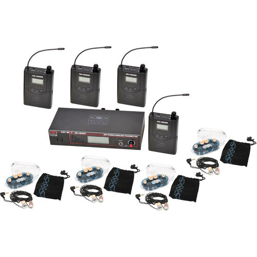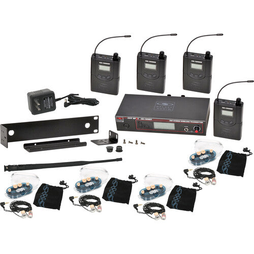 Le Galaxy Audio AS-1200 Band Pack Système de moniteur in-auriculaire sans fil avec 4 récepteurs et écouteurs EB6 Offre aux musiciens et aux interprètes la liberté de surveillance sans fil sur scène avec des composants faciles à utiliser. L'émetteur de table (oreilles de rack est fournie pour la montage à rack) envoie l'audio sans fil aux récepteurs de bodypack à une distance maximale allant jusqu'à 300 '.