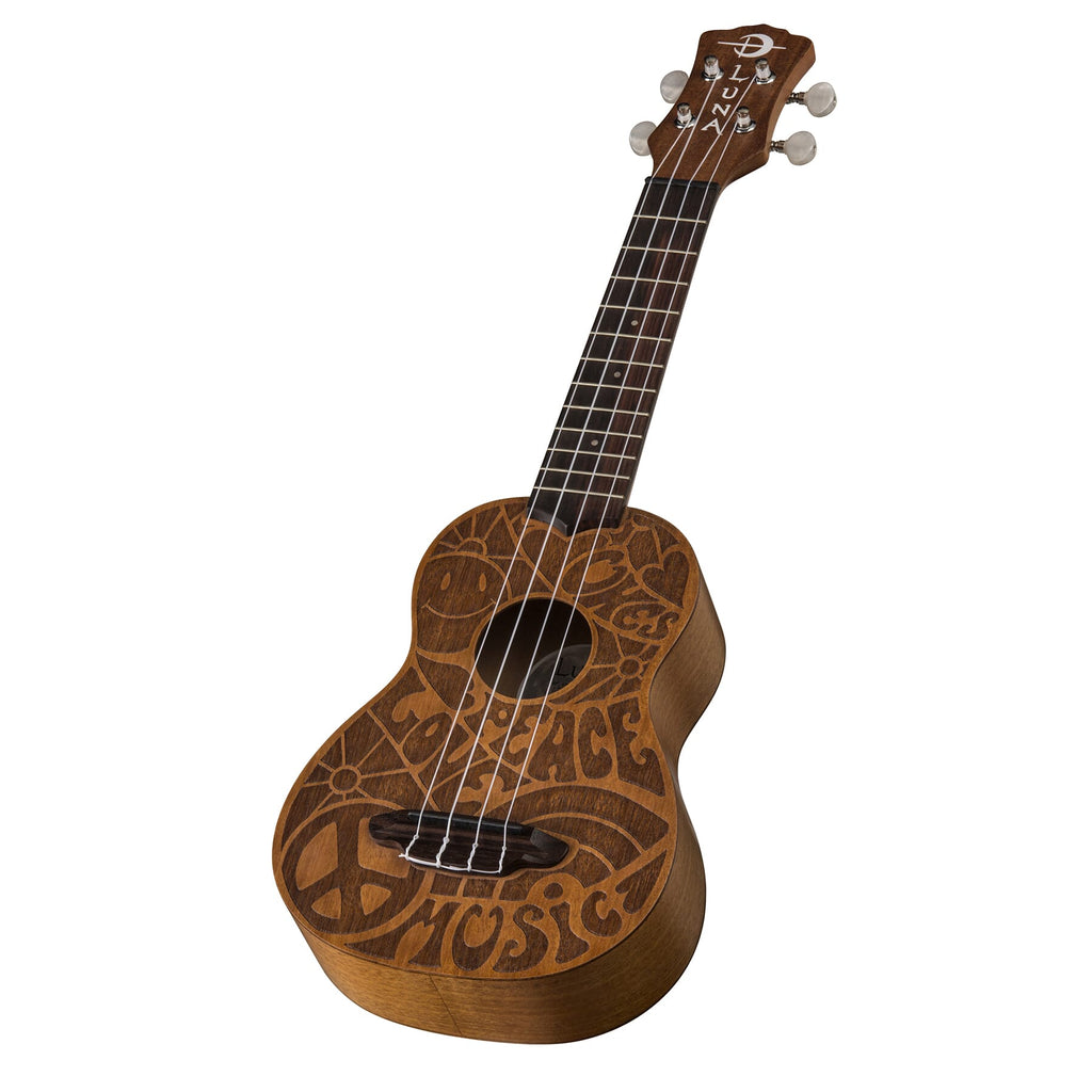 Une construction entièrement en acajou et un motif des années 60 gravé au laser confèrent au Luna UKE PCE Love Music Peace son look et son son uniques.