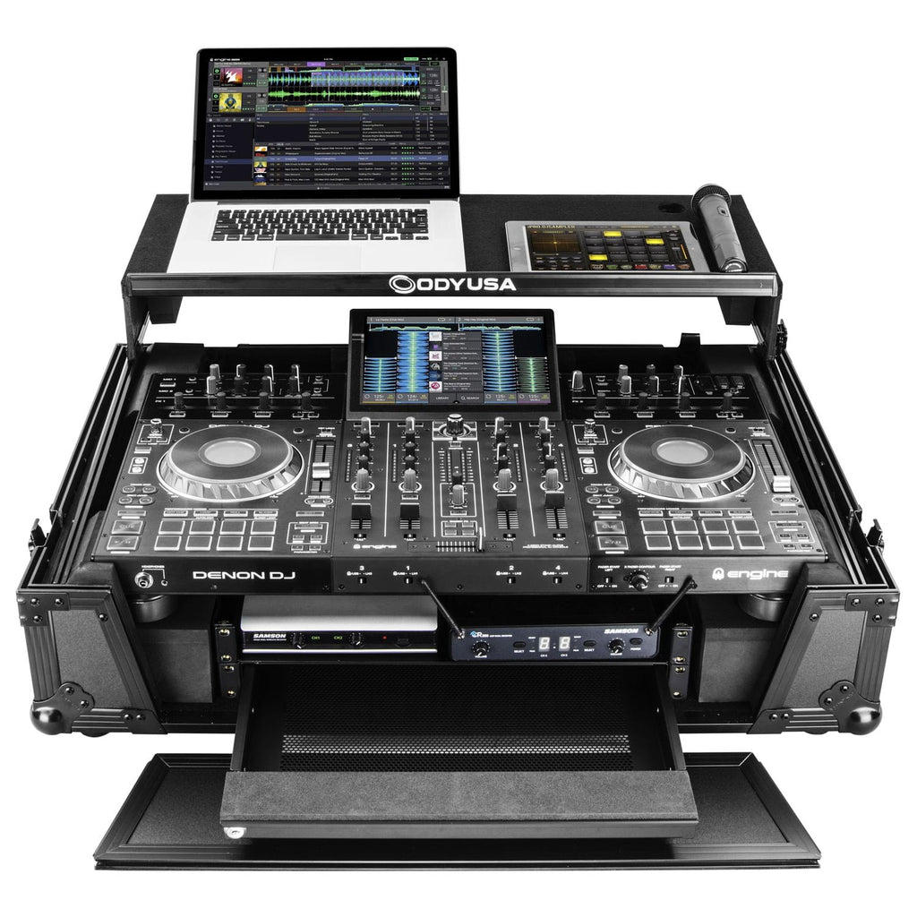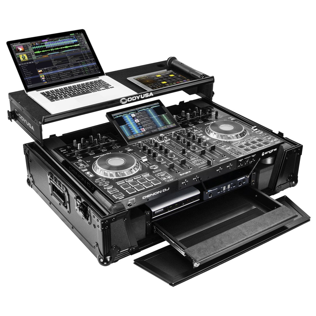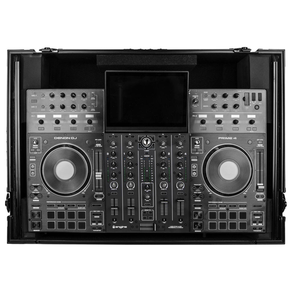 Odyssey FZGSPRIME4W2BL Denon Prime 4 Flight Case noir avec plate-forme brevetée Glide pour ordinateur portable et espace rack 2U